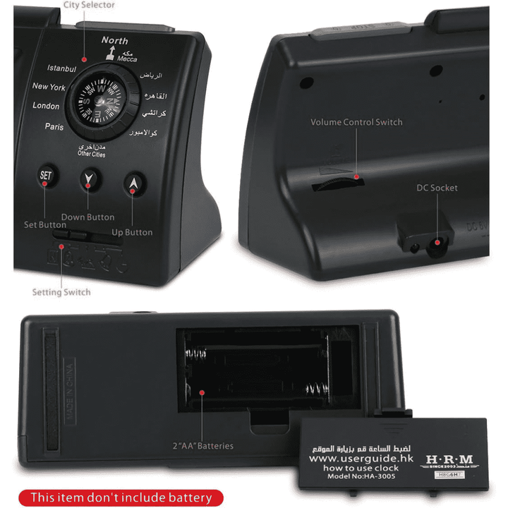 Products Description Muslim Silver Azan Clock *Prayer times for most cities in the world with five calendars are supported for the time of prayer. To easy use programming by international dialing telephone code. *Could easily modify the difference time prayer to the outskirts of cities adopted it. *Special alarm to wake up, works automatically with the possibility of closure. *Prayer alarms to reminders of Iqama or salat time for all prayers. *Full screen LED light Snooze option. *Temperature. Daily alarm. *The possibility turn on or off azan sound imposed on all alone. *Complete azan for all prayers(with volume control). *Hijri and Gregorian calendars. *Daylight saving time option. Two year guarantee.