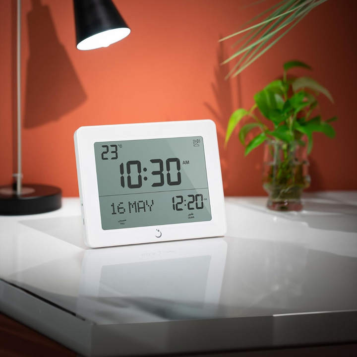It is a beautiful and functional Islamic clock that displays prayer times, Hijri/Gregorian date and time, temperature and more. This clock can be set on a table or hung on a wall, and available in the colors WHITE and BLACK. You can choose from FIVE azan styles;Makkah, Madina, Egypt, AlQuds and Riyadh. The prayer times are automatically set based on your city. Our customers say, it is a beautiful feeling to hear the Azan in the homes.