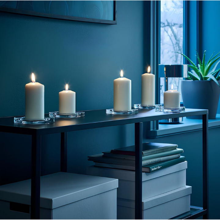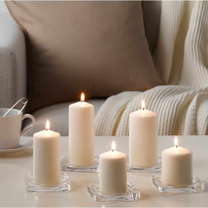 - Size: (height x diameter) 3½x2⅜" (burning time 20h), 4¾x2⅜" (burning time 34h), 5¾x2⅜" (burning time 40h), 3x2½" (burning time 20h), 5x2½" (burning time 40h).