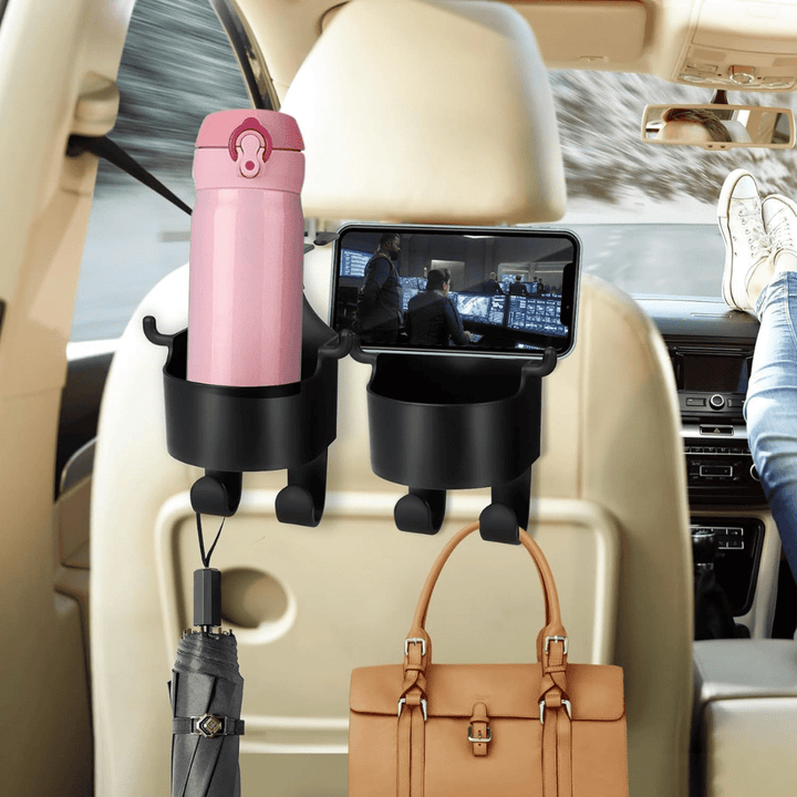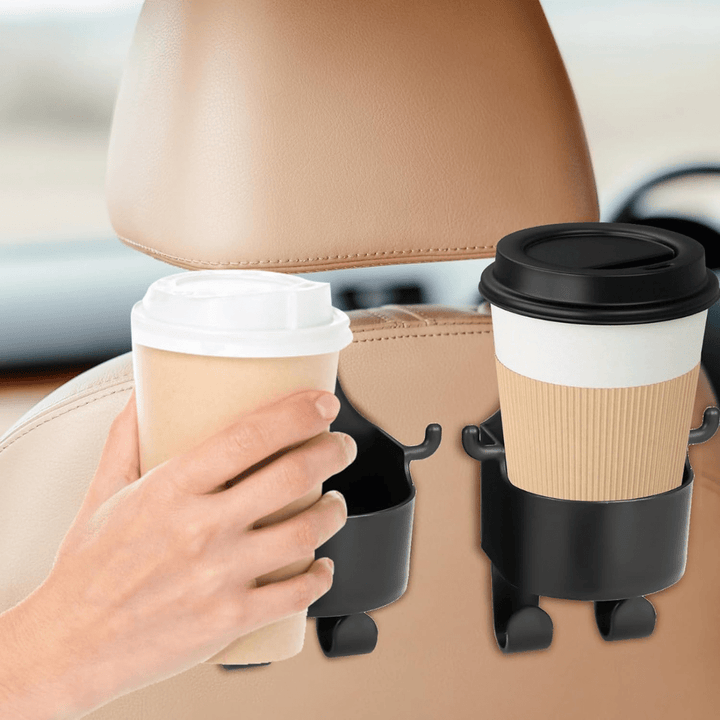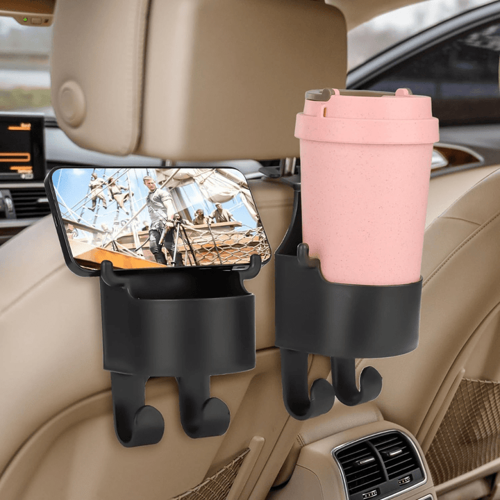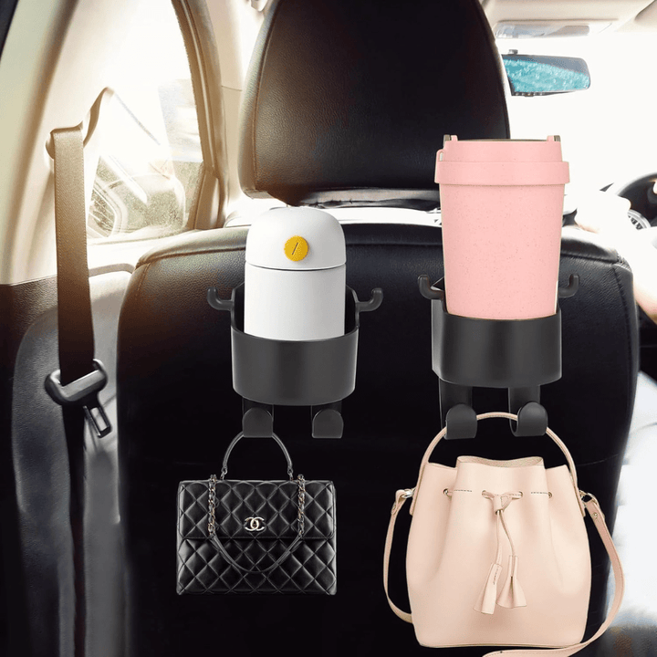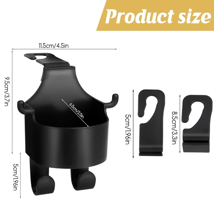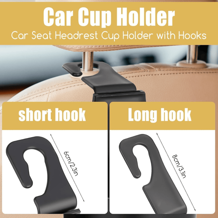Transform your car's interior with our Black Backseat Headrest Hanger Storage Organizer. Each hook is equipped with a built-in bottle holder, ensuring easy access to drinks such as water bottles or coffee cups, enhancing convenience on the go. Constructed from durable materials, these headrest hooks are designed to withstand regular use and offer long-lasting performance.